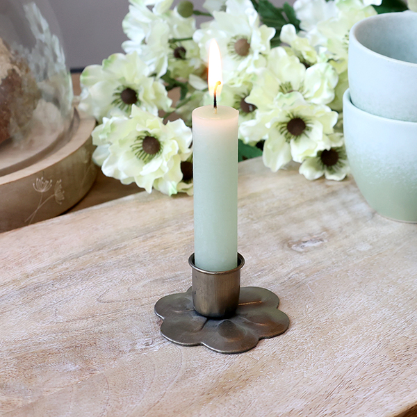 Flower candle holder in antique bass. Have as a single or a few together to create a beautiful setting.