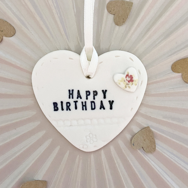 A cute little porcelain heart decoration with ‘Happy Birthday’ stamped and a lace pattern across the surface.