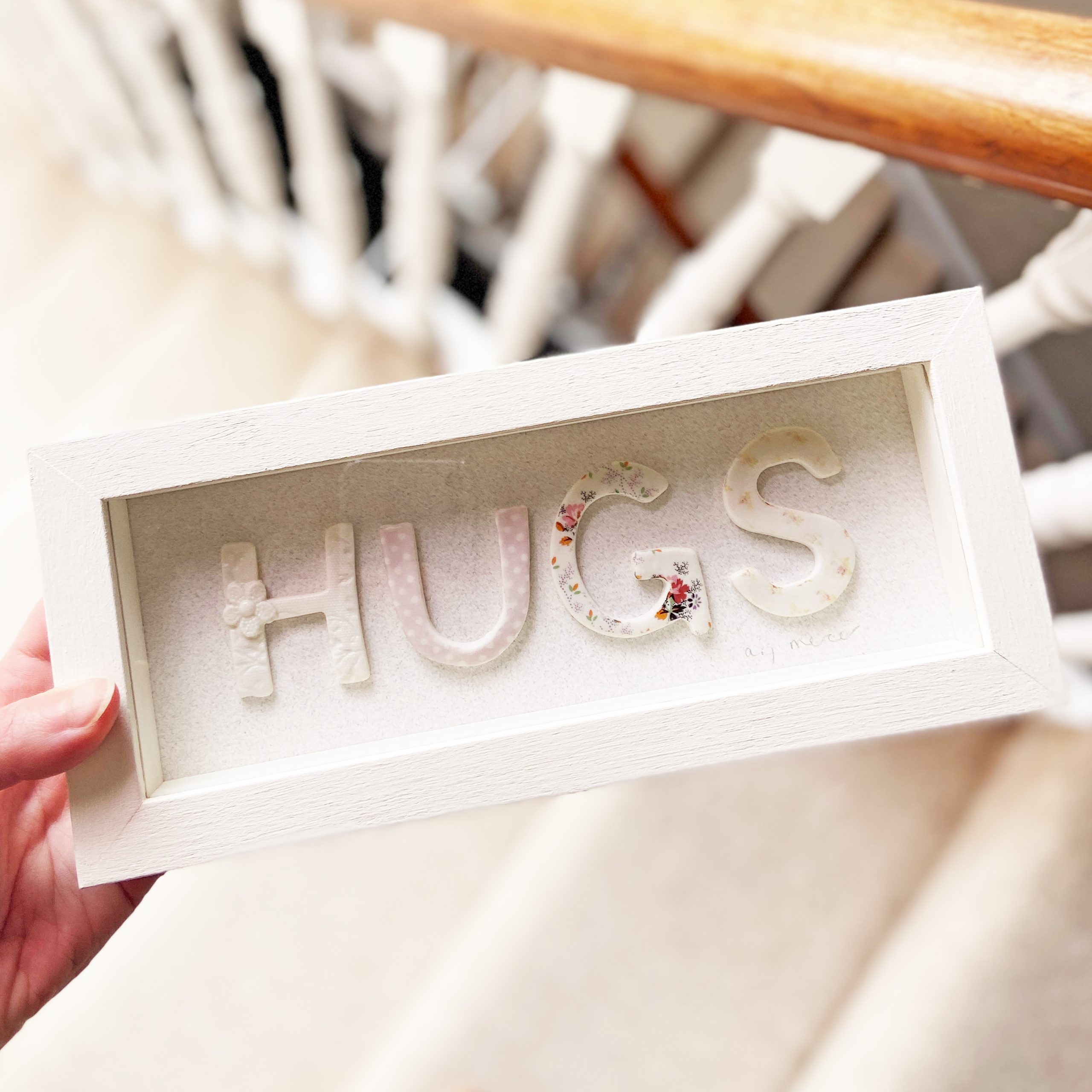 Sending hugs… a pretty framed ‘Hugs’ picture. Looks beautiful free standing or equally hung on a wall. Each letter is individually handcrafted from porcelain and presented in a hand made and painted white wooden frame. Makes a perfect gift for a loved one or a little treat for your own home.