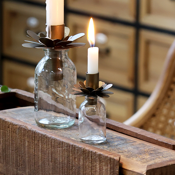 Cute tiny bottle and a flower candle holder in antique bass. Perfect for creating a cosy setting or for a gift.