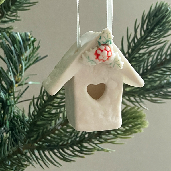 A pretty little holly house decoration. Handcrafted from fine white porcelain with a delicate lace imprint and a touch of festive holly.