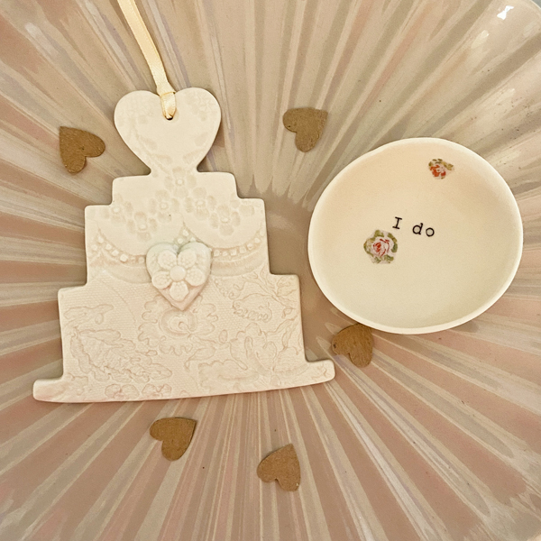 A pretty Wedding cake decoration and little porcelain dish. Lovely to be used as a ring dish for a gift or keepsake for a wedding gift. Handcrafted from porcelain with a sweet floral design and ‘I do’ on the inside.